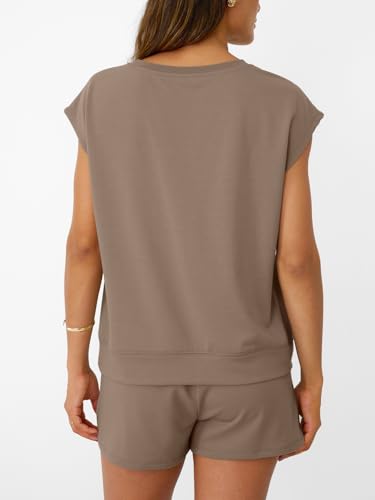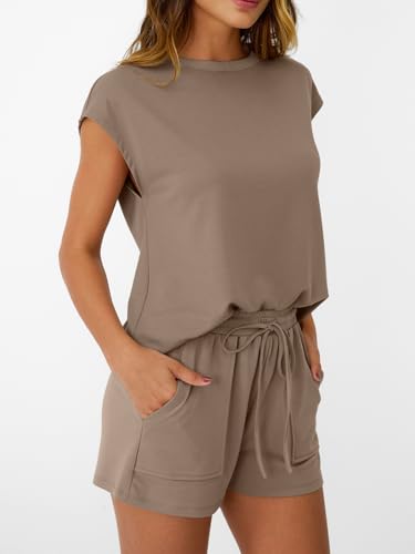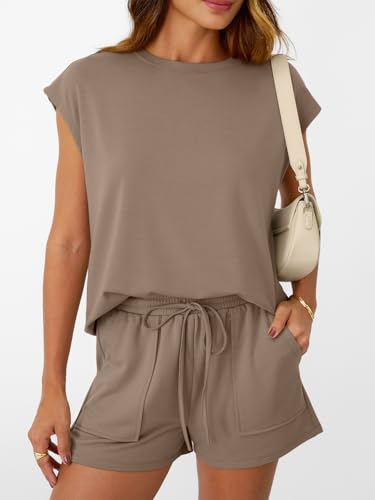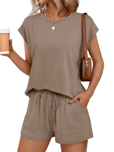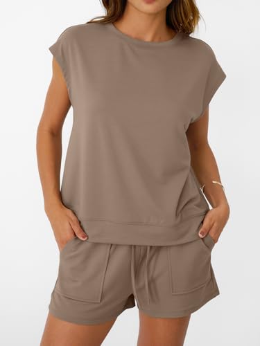 Specification: AUTOMET Womens Crew Neck Two Piece short Sets Cap Sleeve Drawstring Summer Sweatsuit with Pocket