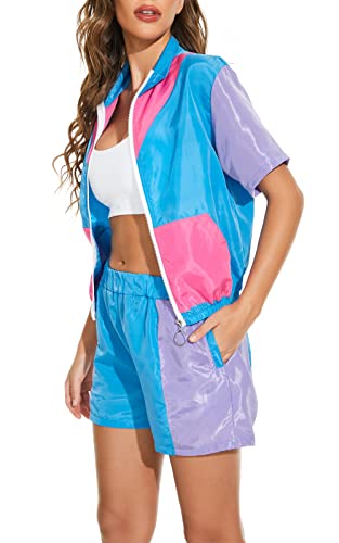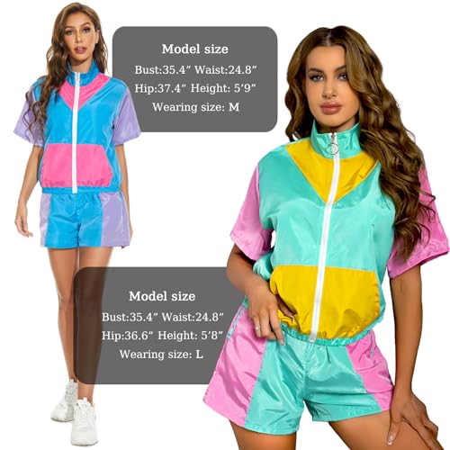 Specification: Yisfri Women’s Color Block Windbreaker 2 Piece Outfits Short Sleeve Zip Front Elastic Waist Tracksuit Set